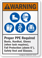 These signs list equipment requirements using the ANSI Z535 format. They combine text with standard symbols for glasses, gloves, and boots. View our ansi ppe signs for various layout options.