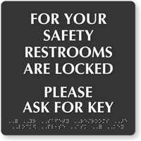 Bathroom keychains prevent key loss/theft in public restrooms, clearly identify facility keys for staff, reduce germ transmission by minimizing surface contact, and ensure keys return to proper locations. They are often used alongside our restroom signs.