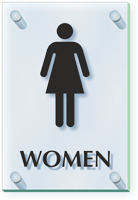 Almost all our signs, whether engraved, wooden, designer, showcase or sliding, make for excellent options for workplaces. You can also try our ClearBoss Women’s Restroom Signs. ClearBoss Signs look like glass, but they are made of 215 mil (0.22 inch) thick acrylic sheet that is crystal clear and more durable than glass. It is easy to keep the signs shiny and clean. Sign comes with pre-drilled holes and satin aluminum caps and standoff barrels for installation. The sign offsets the wall or door and gives a very sophisticated and professional look.