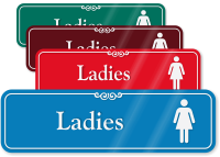 • • Choose from scratch- and chemical-resistant Ladies Restroom Signs in various colors to match your interiors.