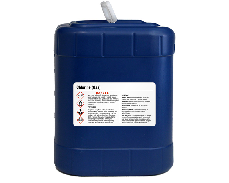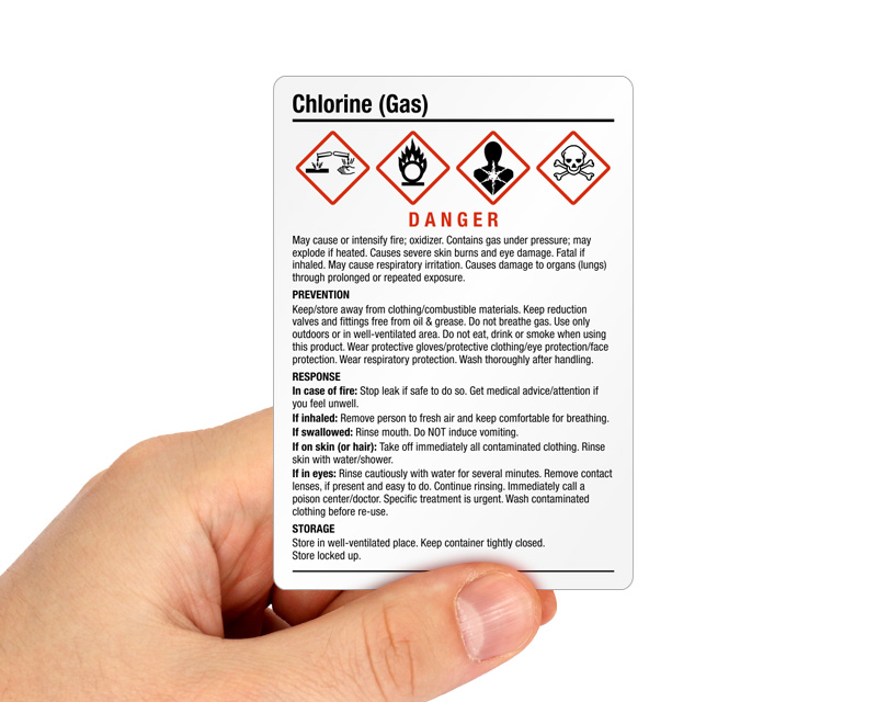 Untrained or negligent employees may expose themselves to Chlorine gas, facing severe damage to the respiratory system, eyes, and skin. GHS Chemical Labels inform workers about the hazards associated with Chlorine Gas, the precautionary measures, and the response to be taken after accidental exposure.