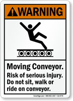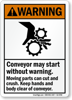 Warnings near the conveyor belts are a must! Without the conveyor warning labels your workers will not be aware of potential dangers that lay ahead. ANSI/ASME B20.1-Safety Standard for conveyors and related equipment regulates that conveyor warning signs must be used to point to an immediate risk or hazard that can cause injuries or even death.