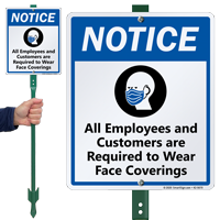 Face covering required signs should be used in all public spaces to help prevent the spread of the virus, including parking lots, pavements, take outs and, drive-ins You can use BigBoss A-frame signs, Stand-up Floor Signs, and the hard-to-miss SignPosts to urge your customers to wear a mask as they wait in their cars.