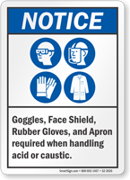 Yes, our goggles face shield gloves required ANSI notice sign and other multi-hazard options from our hand protection signs collection display multiple PPE requirements on a single sign including gloves alongside hard hats, safety glasses, hearing protection, and safety footwear, the most efficient format for facility entries where multiple protective equipment items are required simultaneously.