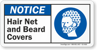 We carry hair covering required signs for food processing plants, commercial kitchens, pharmaceutical facilities, cleanrooms, and laboratory environments. Signs are available in OSHA and ANSI-compliant formats in aluminum, plastic, and adhesive vinyl with the hair covering PPE pictogram - ideal for posting at all entry points to hygiene-controlled production and processing areas.