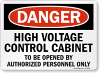 Our high voltage signs are available in aluminum, plastic, and adhesive formats in Danger header red/black/white designs for immediate life-threatening hazards, coming in multiple sizes ideal for electrical panels, utility rooms, substations, and industrial equipment.