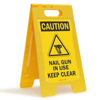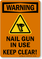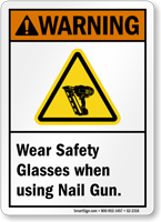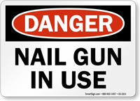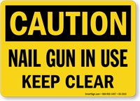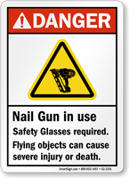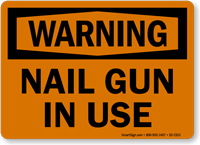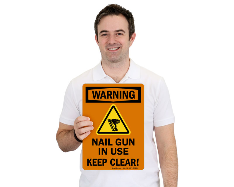 Nail Guns Safety Signs alert residential carpenters and other workers using nail guns to be safe from flying objects and other hazards in the vicinity. Residential home builders, construction contractors, subcontractors, and supervisors must ensure they post warning signage and train workers for safe practices. Signs prompt them to wear adequate personal protective equipment.