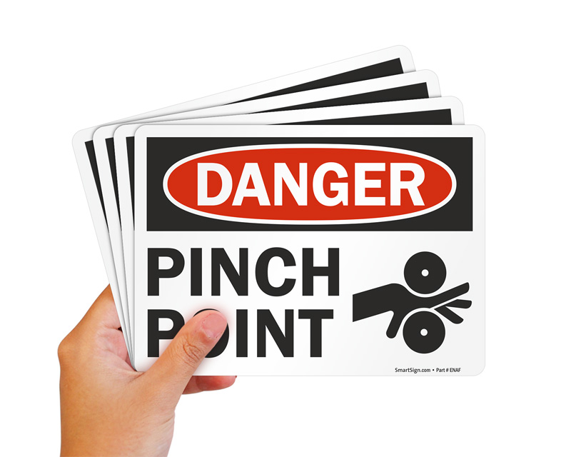 Our pinch point signs feature bold pictographs and proven text messages available in vinyl, heavy-duty plastic, and aluminum for both indoor and outdoor use on manufacturing equipment, conveyor systems, press brakes, and any machinery with dangerous nip or pinch points.