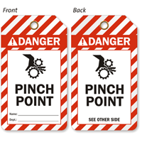 Yes, OSHA and ANSI Z535 require that machinery hazards including pinch and nip points be clearly marked with appropriate warning signs, and our pinch point signs are available in OSHA and ANSI-compliant Danger, Warning, and Caution headers with the correct color schemes and symbol pictographs to satisfy regulatory requirements at every piece of hazardous machinery.