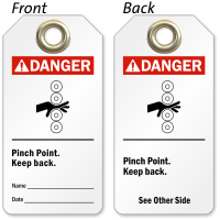 Yes, OSHA and ANSI Z535 require that machinery hazards including pinch and nip points be clearly marked with appropriate warning signs, and our pinch point signs are available in OSHA and ANSI-compliant Danger, Warning, and Caution headers with the correct color schemes and symbol pictographs to satisfy regulatory requirements at every piece of hazardous machinery.