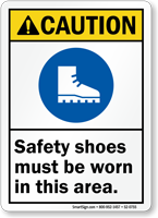 Yes, our customizable safety shoe sign templates allow you to add specific ASTM footwear standards, protection ratings, toe cap requirements, or additional PPE that must be worn alongside protective footwear, and our steel toe shoes required in this area sign is one example of our more specific stock options for facilities with defined footwear specifications.