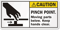 Protect hands. Pinch and Nip Points can be a rapid and menacing danger. Handy labels warn just when and where a warning is especially needed. Detachable arrow labels show exactly the point of danger. Pinch Point Stickers are sure to save workers from accidents and injury.