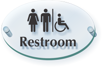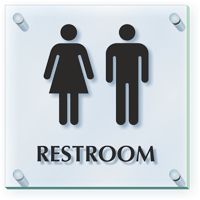 We use thick, crystal clear acrylic sheets to make our ClearBoss unisex bathroom signs. These acrylic signs are more durable than glass and come with satin aluminum caps and standoff barrels that keep the acrylic panel offset from the wall or door.