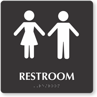 • • Our restroom signs comply with ADA signage requirements with raised letters, California Grade II Braille, symbols for enhanced accessibility.