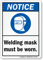 The sign should also remind workers of other required PPE, such as fire-resistant gloves and protective clothing. A "Welding Mask Must Be Worn" notice sign provides a clear, mandatory instruction, while a "Arc Flashes Can Damage Eyes" sign reinforces the reason for the policy.